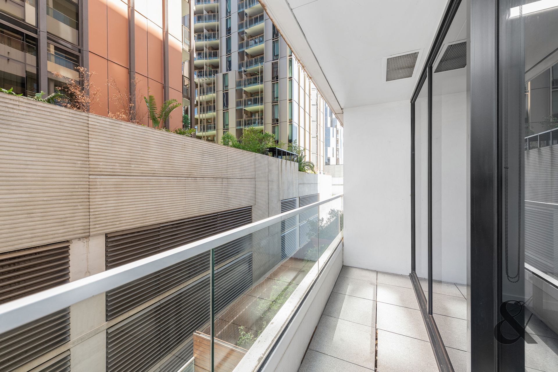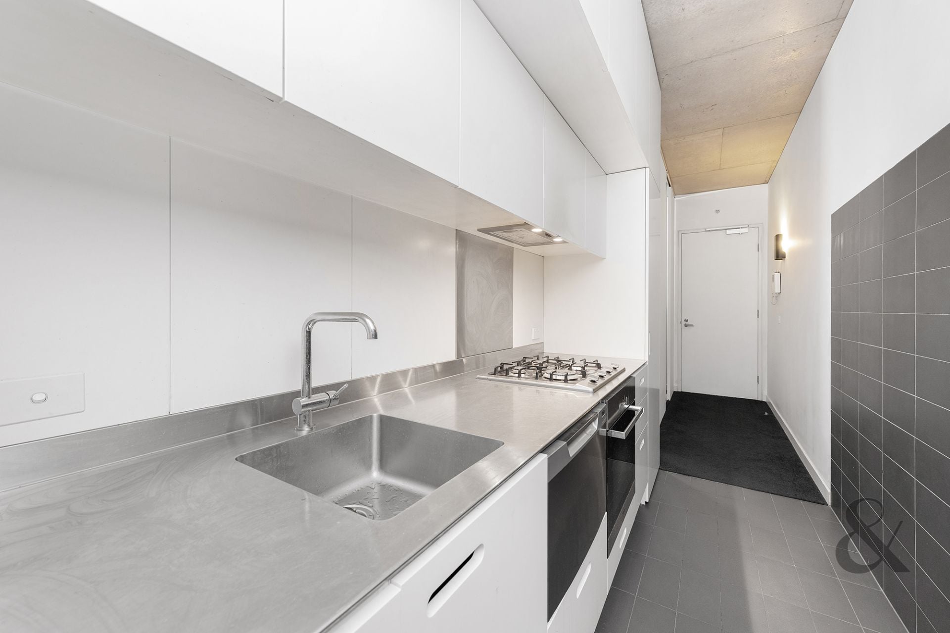 Inside, Apartment 415 features a modern one-bedroom, one-bathroom layout with central heating and cooling. The kitchen includes a stainless steel benchtop, integrated dishwasher, sink, oven, gas stovetop and a euro style laundry space.